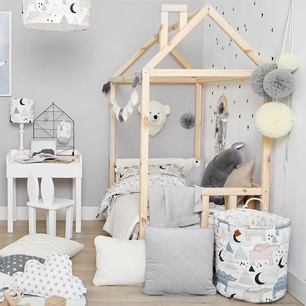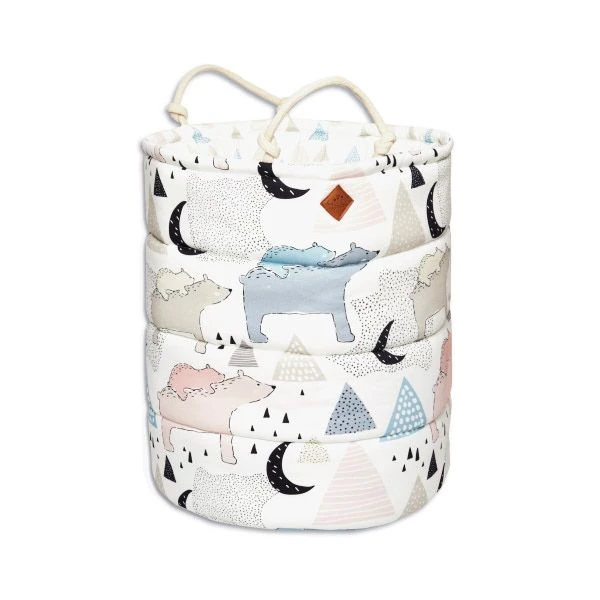 A capacious and functional basket for your child’s toys and other treasures. It can also hold blankets, pillows, clothes or laundry. Originally quilted, it has two laced handles.
