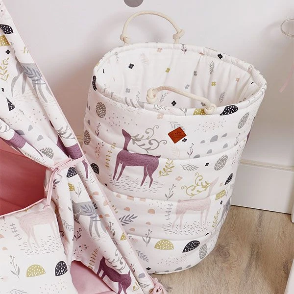 A capacious and functional basket for your child’s toys and other treasures. It can also hold blankets, pillows, clothes or laundry. Originally quilted, it has two laced handles.