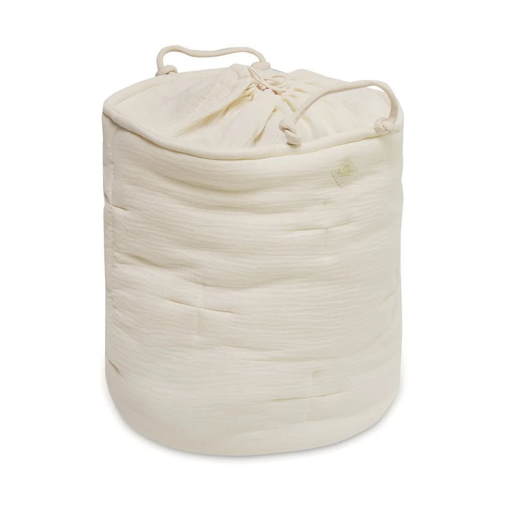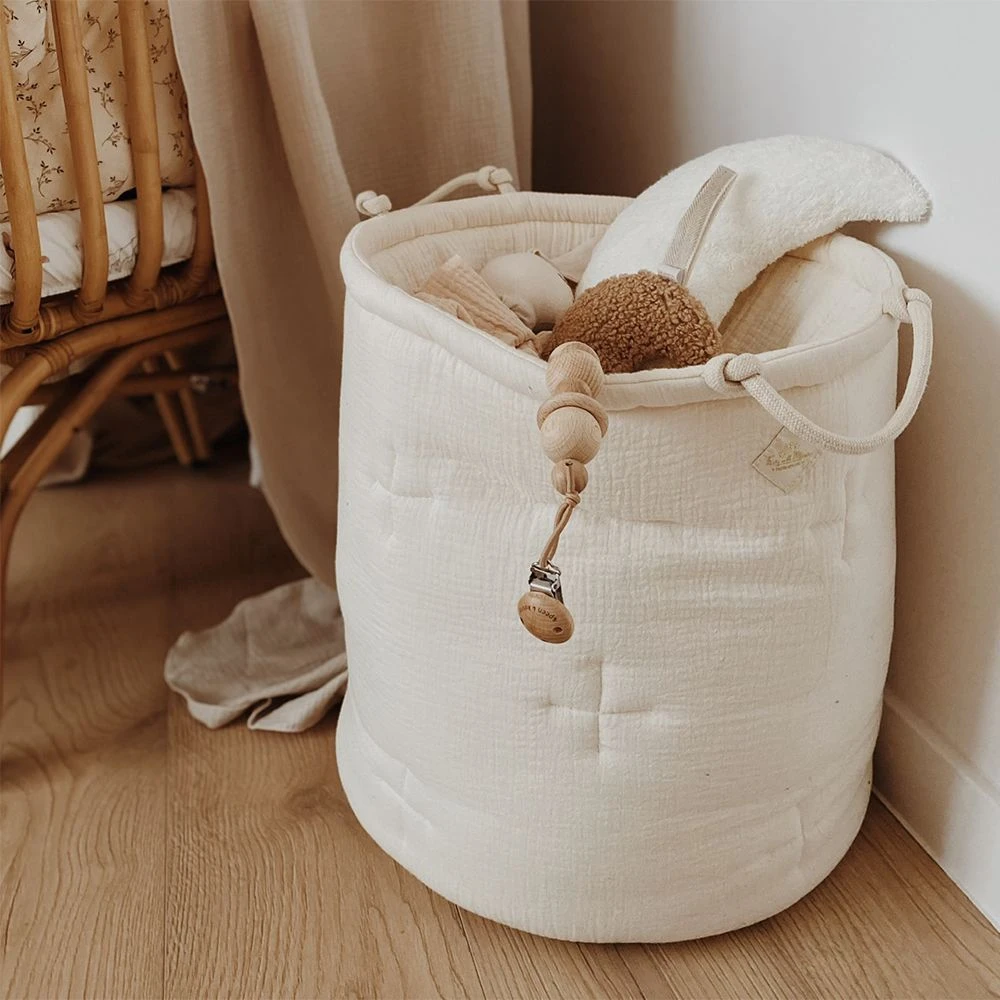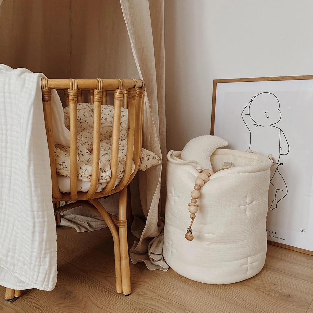 A capacious and functional basket for your child’s toys and other treasures. It can also hold blankets, pillows, clothes or laundry. Originally quilted, it has two laced handles.