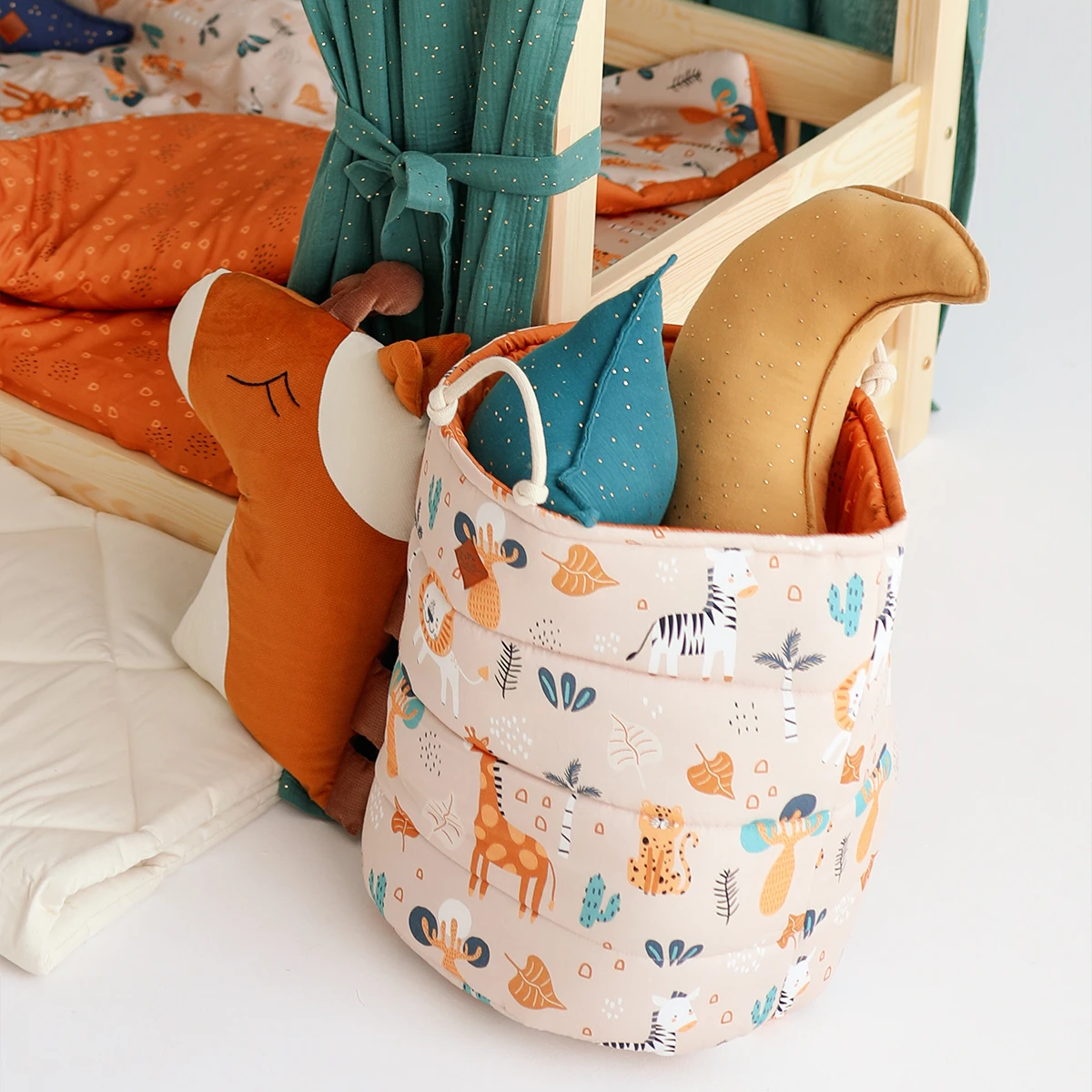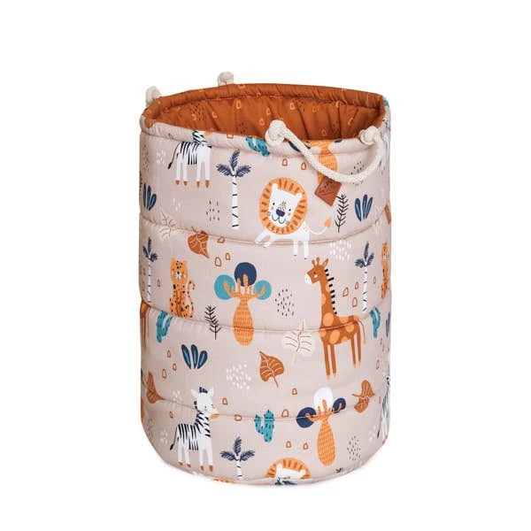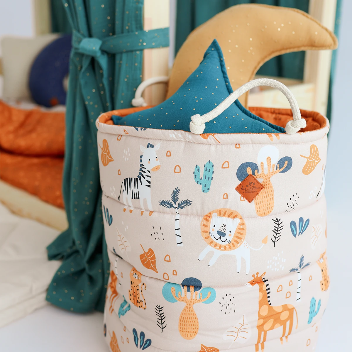 A capacious and functional basket for your child’s toys and other treasures. It can also hold blankets, pillows, clothes or laundry. Originally quilted, it has two laced handles.