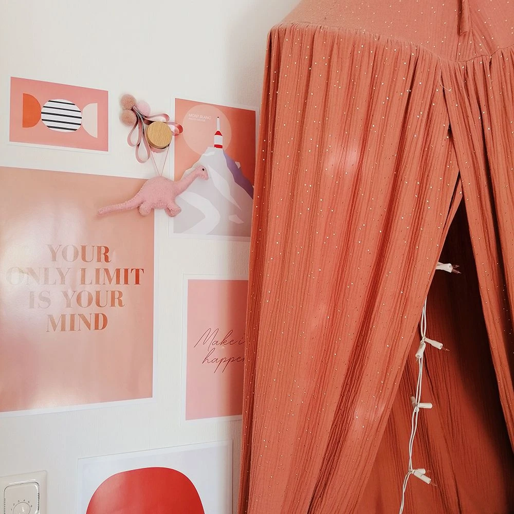 The canopy is made of soft and delicate cotton muslin. The material is decorated with small gold dots that add to its charm and style.