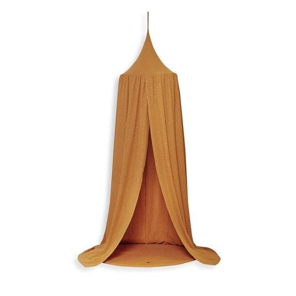 The canopy is made of soft and delicate cotton muslin. The material is decorated with small gold dots that add to its charm and style.
