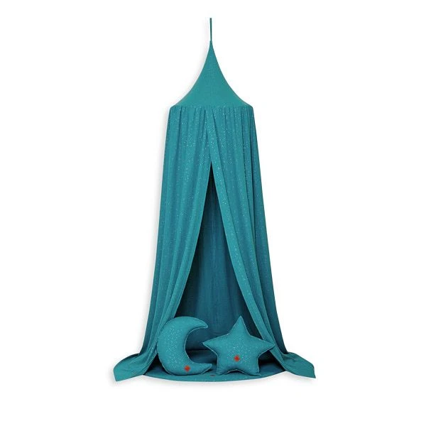 The canopy is made of soft and delicate cotton muslin. The material is decorated with small gold dots that add to its charm and style.