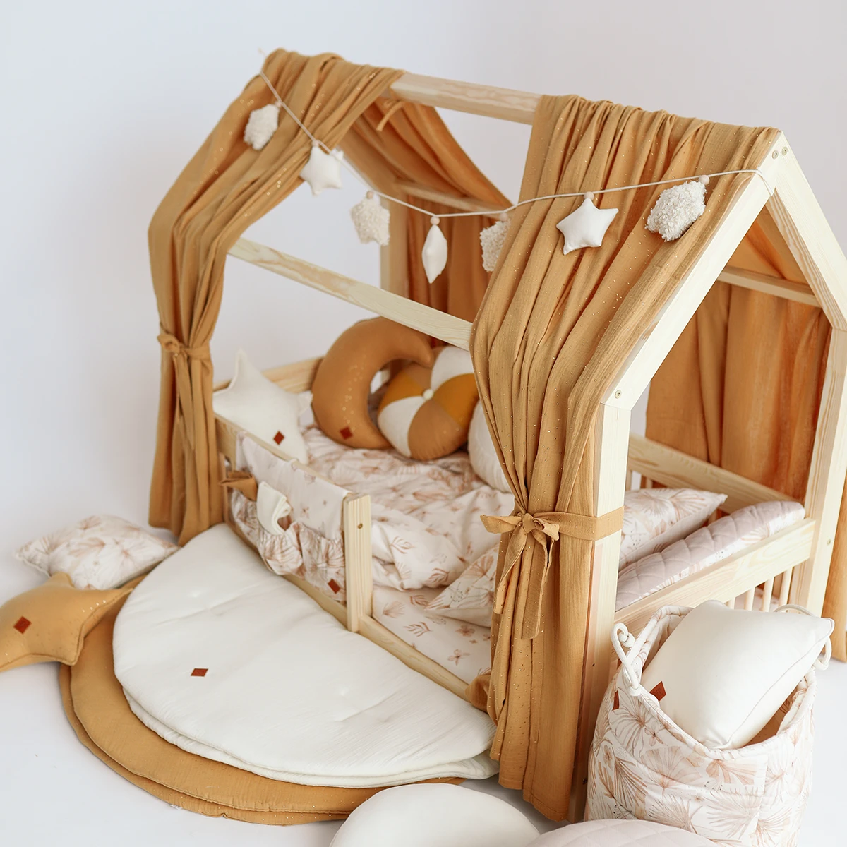 Create a unique sleeping and playing space for your little one with our muslin house cot curtains. They are not only a practical accessory, but also a beautiful decorative element that will delight children and adults alike.