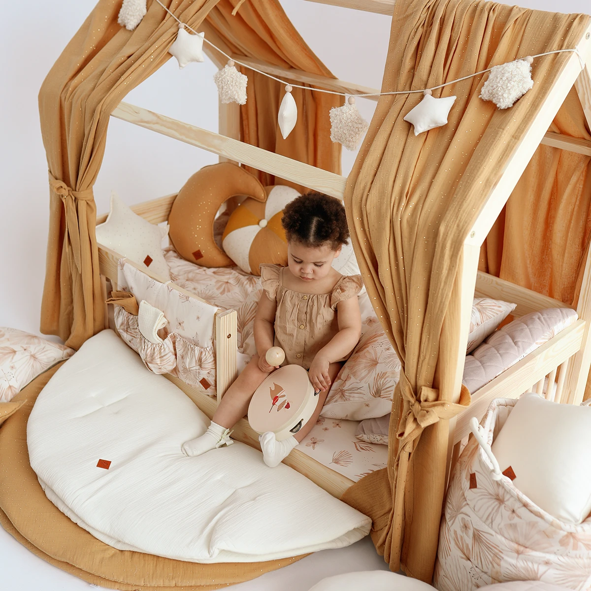 Create a unique sleeping and playing space for your little one with our muslin house cot curtains. They are not only a practical accessory, but also a beautiful decorative element that will delight children and adults alike.