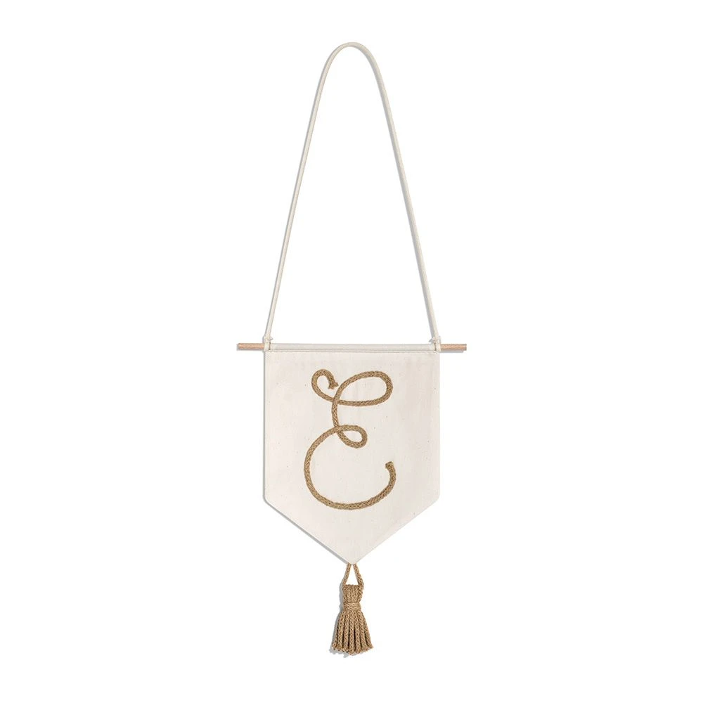 The cotton pennant hangs on a wooden stick with a threaded string to hang anywhere. It is finished with a beautiful hoop for an elegant look.