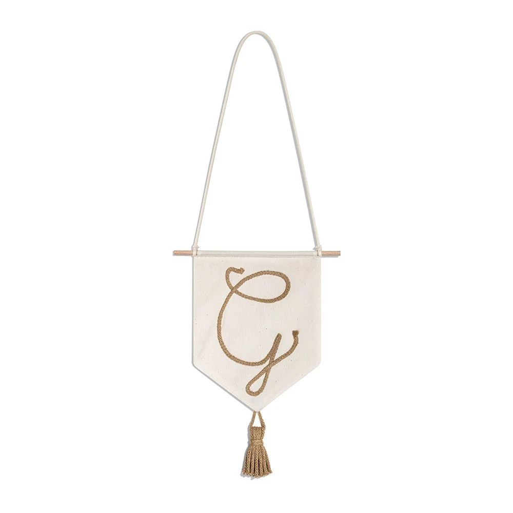 The cotton pennant hangs on a wooden stick with a threaded string to hang anywhere. It is finished with a beautiful hoop for an elegant look.
