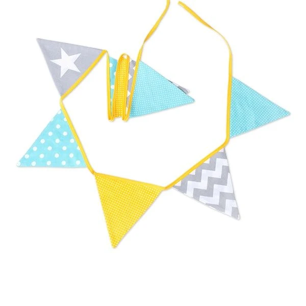 Multi-coloured, made 100% out of cotton. It has 9 triangles and the band length is 235 cm, with triangle dimensions of 17/17 cm.