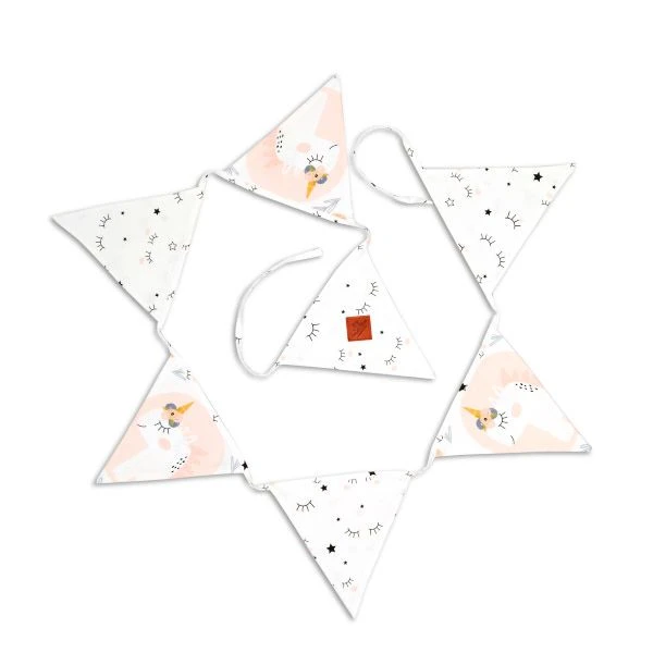 Multi-coloured, made 100% out of cotton. It has 7 triangles and the band length is 200 cm, with triangle dimensions of 17/17 cm.