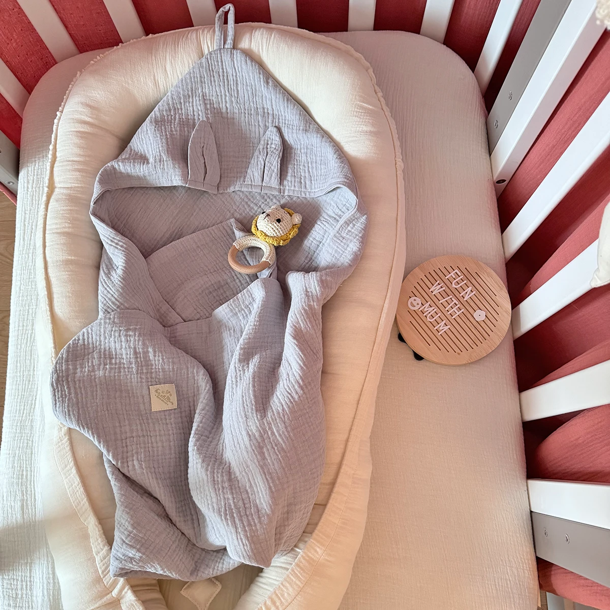 Thanks to the light and airy structure of the muslin, the wrap is ideal for summer, providing optimum temperature and comfort. The practical hood adds functionality, protecting baby’s delicate head after bathing or during summer walks.