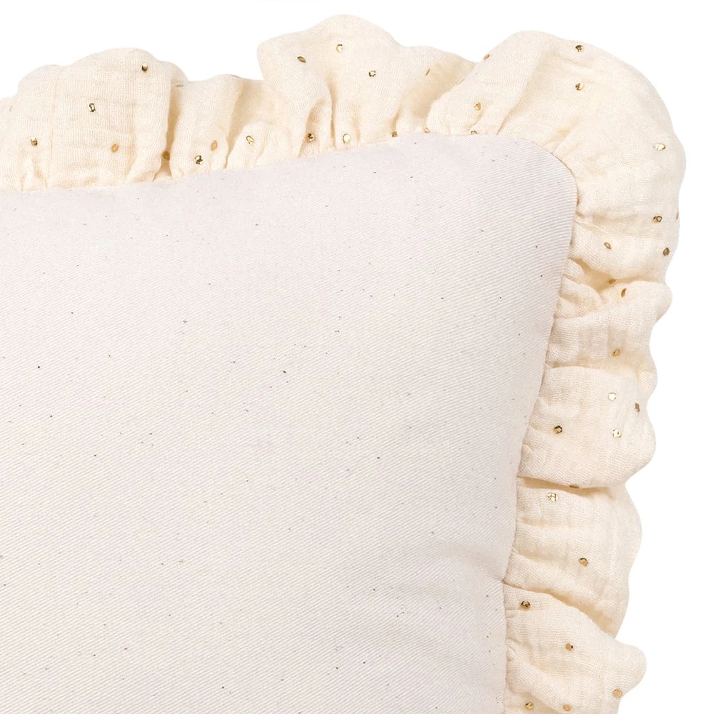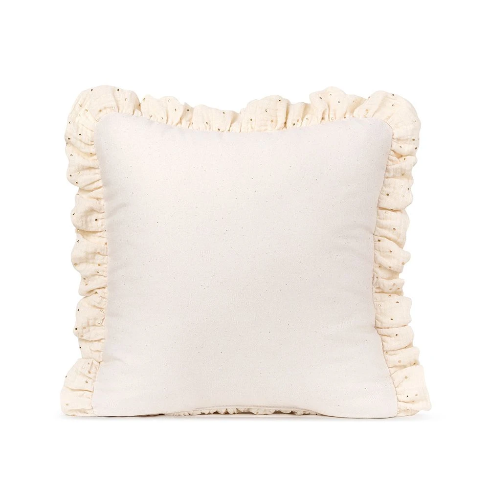 A decorative square-shaped cushion finished with an extremely decorative frill. The frill in the cushion is made of cotton muslin with elegant gold dots.