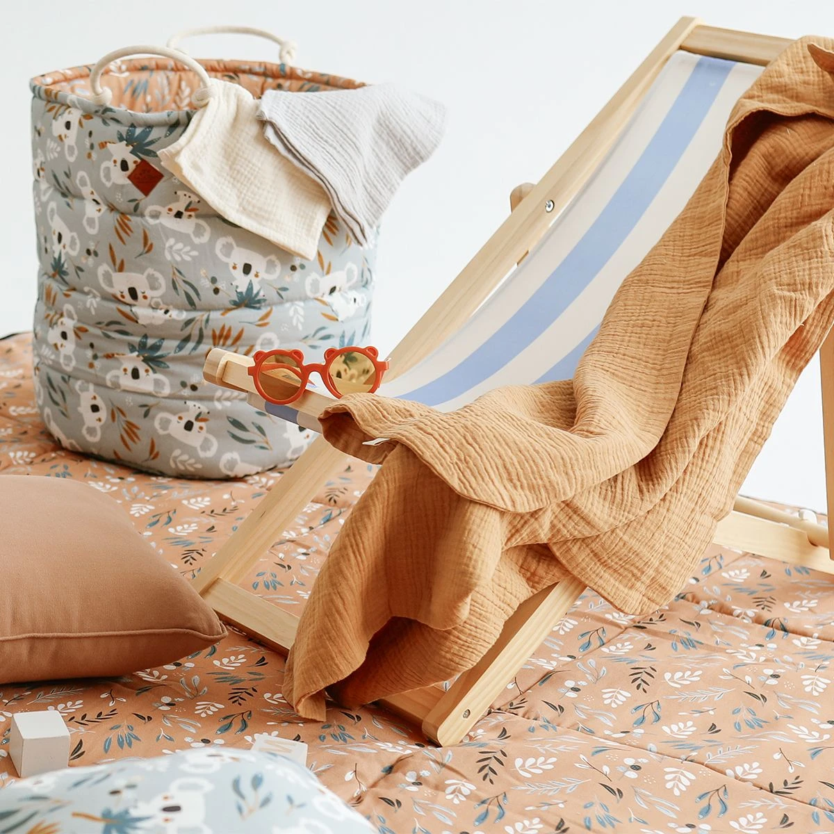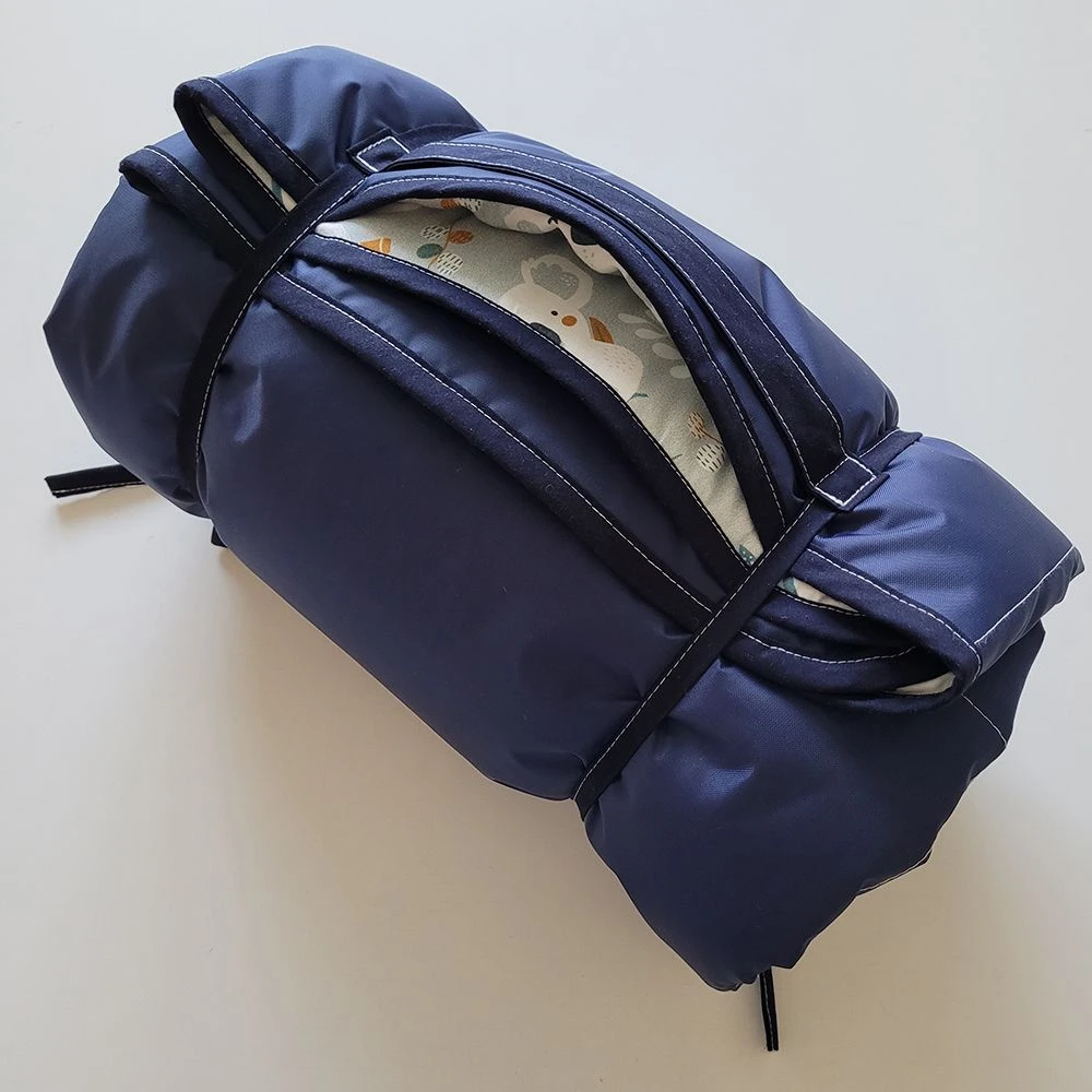 The picnic mat may be folded to a small size and tied with specially-designed colourful bands. The practical handle makes it easy to carry or attach to stroller handles, etc.