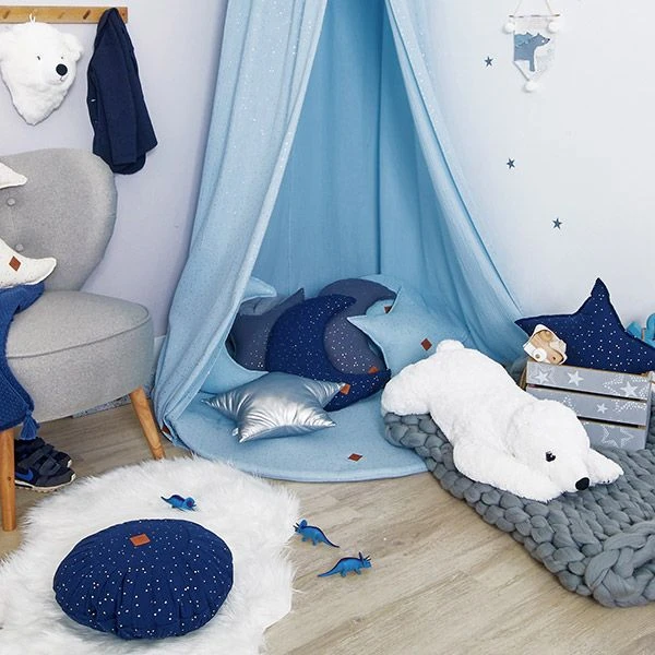 Decorative round cushion from the muslin collection. The cushion will be a beautiful decoration for a child’s room. It will add a cosy and stylish touch to the interior. The cushion fits perfectly with our canopy. In combination with other cushions from the collection, it will create a unique arrangement.