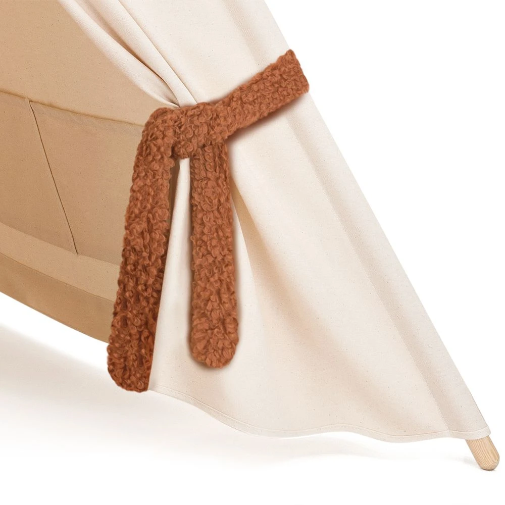 It is made of two fabrics with different colours and textures. On the front it has an unusual boucle fabric in a lambskin style. It has an adorable window with a curtain trimmed in plush boucle fabric and a door tied with large fluffy boucle straps.