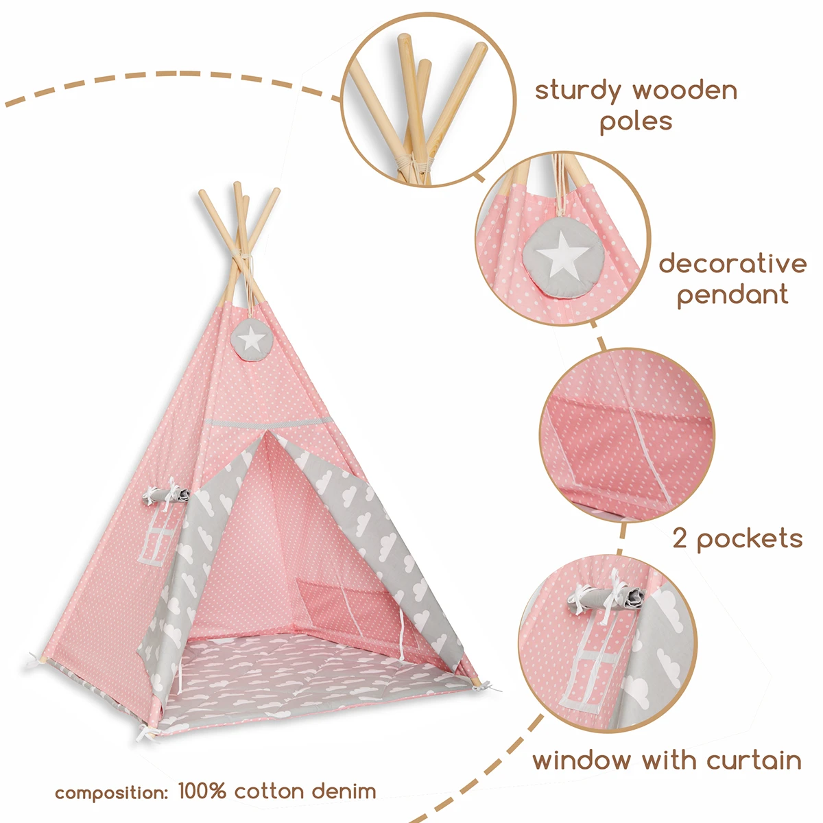 The tepee tent will be a great hideout for your child for any season. It will be perfect for your apartment, patio, balcony or garden. It will embellish any interior and make it cosy. It can hold not only the child, but also the parent, happy to read the little one a bedtime story.