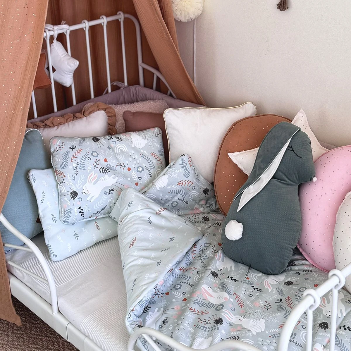 The duvet and pillow were manufactured using top-quality materials to ensure comfortable and safe sleep for your baby. The duvet and pillow are two-sided and made with two 100% cotton fabrics in varied colours. The inner part of the duvet and pillow contains hypoallergenic, fluffy silicone filling that ensures warmth and breathability. The two-sided colour scheme is the reason why this set will never be boring. You can change the interior arrangement of your child’s room.