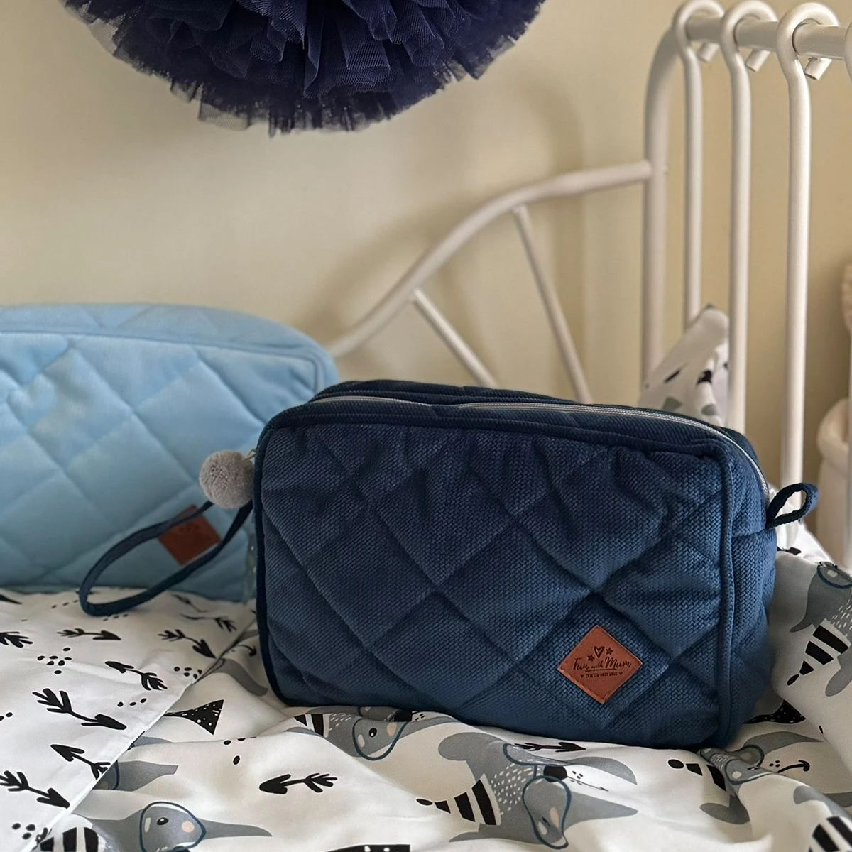 The bag is made of soft quilted velvet, and its inside is made of high-quality satin cotton. It can be closed with a handy zip with a cute pom pom. There is also a sewn-in handle for easy handling.